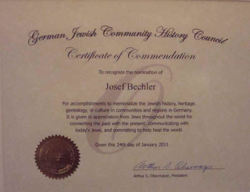 Der Preis, der bereits zum elften Mal verliehen wurde, wird jährlich auf Vorschlag von jüdischen Bürgern weltweit an fünf Deutsche vergeben, die an ihren Heimatorten einen herausra­genden Beitrag zu Bewahrung des Gedenkens an die jüdische Vergangenheit geleistet haben. In seiner Laudatio würdigte das Ortsoberhaupt die „wichtige und wertvolle Arbeit" von Josef Bechler.